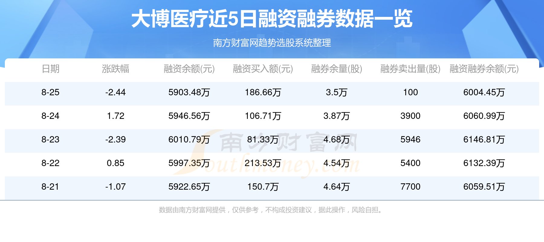 8月25日大博医疗融券信息显示,融资方面,当日融资买入186.66万元,融资偿还229.75万元,融资净买额-43.08万元。融券方面,融券卖出100股,融券偿还3800股,融券余量3.5万股,融券余额100.97万元。融资融券余额6004.45万元。近5日融资融券数据一览见下表: