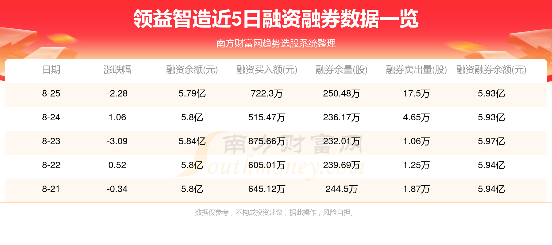 8月25日领益智造融券信息显示,融资方面,当日融资买入722.3万元,融资偿还789.04万元,融资净买额-66.74万元。融券方面,融券卖出17.5万股,融券偿还3.19万股,融券余量250.48万股,融券余额1395.17万元。融资融券余额5.93亿元。近5日融资融券数据一览见下表: