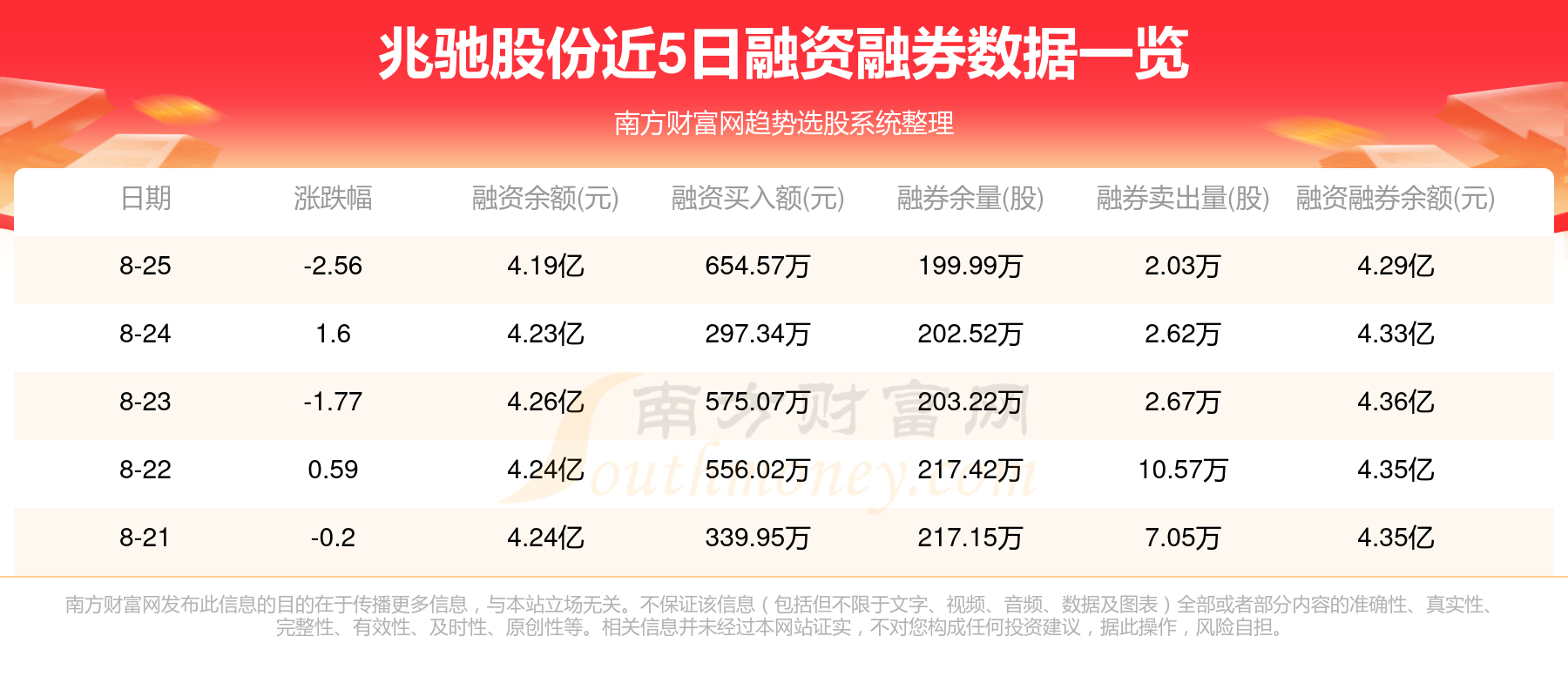 兆驰股份8月25日融券信息显示,融资方面,当日融资买入654.57万元,融资偿还1051.93万元,融资净买额-397.36万元。融券方面,融券卖出2.03万股,融券偿还4.56万股,融券余量199.99万股,融券余额987.96万元。融资融券余额4.29亿元。