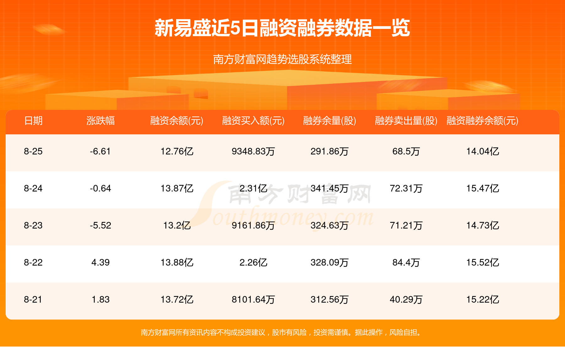 新易盛8月25日融券信息显示,融资方面,当日融资买入9348.83万元,融资偿还2.05亿元,融资净买额-1.12亿元。融券方面,融券卖出68.5万股,融券偿还118.09万股,融券余量291.86万股,融券余额1.28亿元。融资融券余额14.04亿元。近5日融资融券数据一览见下表: