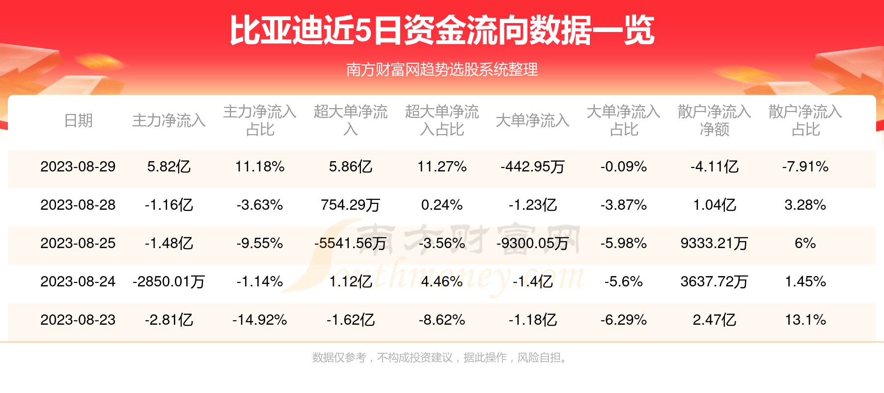 8月29日消息,比亚迪主力净流入5.82亿元,超大单净流入5.86亿元,散户净流出4.11亿元。