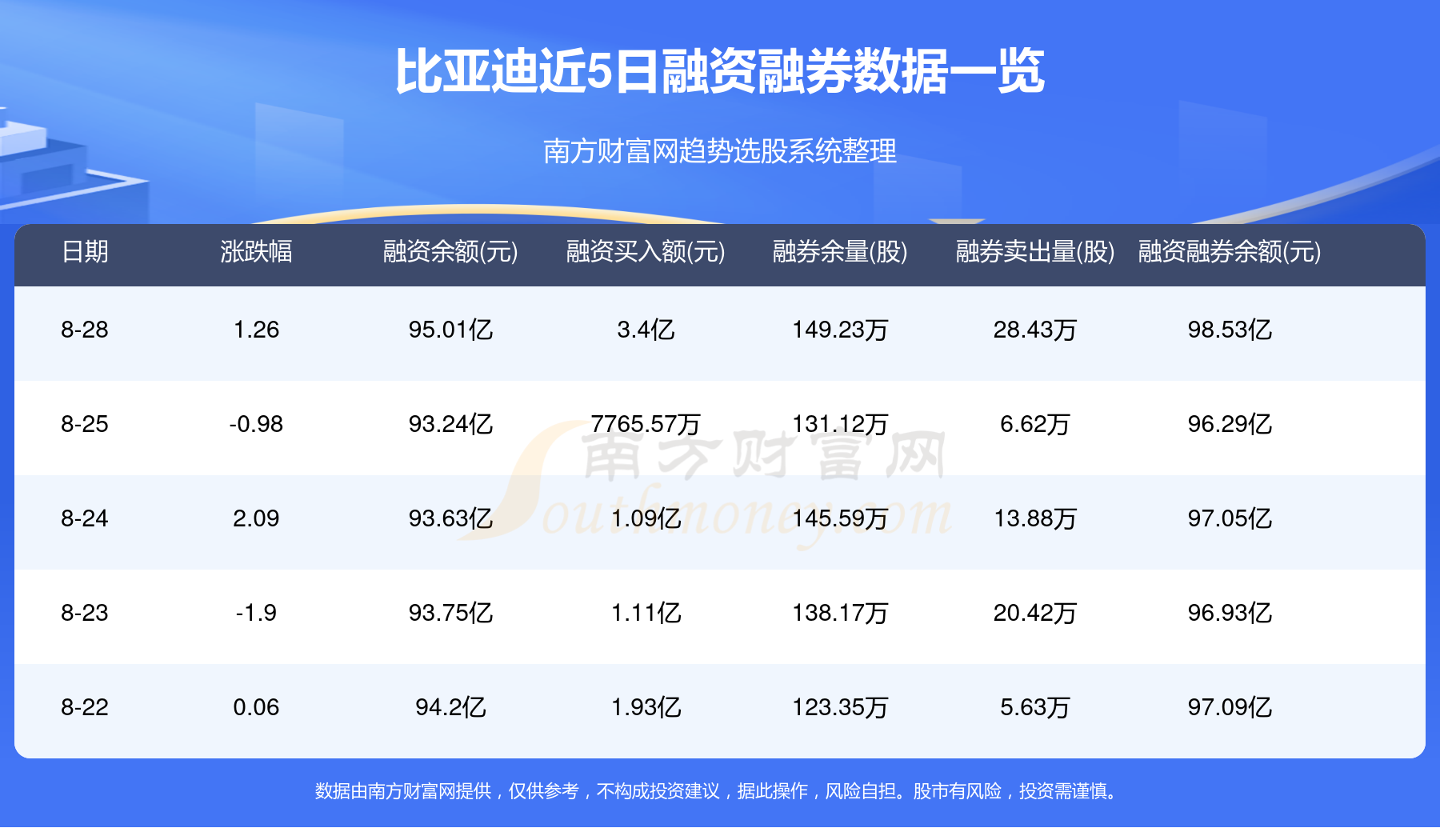 8月28日比亚迪融券信息显示,融资方面,当日融资买入3.4亿元,融资偿还1.64亿元,融资净买额1.77亿元。融券方面,融券卖出28.43万股,融券偿还10.32万股,融券余量149.23万股,融券余额3.51亿元。融资融券余额98.53亿元。