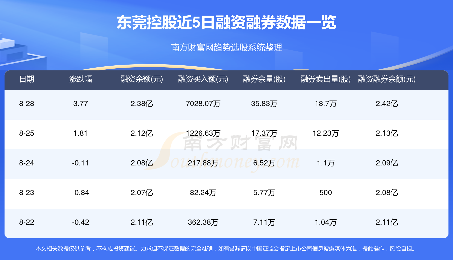 8月28日东莞控股融券信息显示,融资方面,当日融资买入7028.07万元,融资偿还4389.13万元,融资净买额2638.94万元。融券方面,融券卖出18.7万股,融券偿还2400股,融券余量35.83万股,融券余额355.08万元。融资融券余额2.42亿元。近5日融资融券数据一览见下表:
