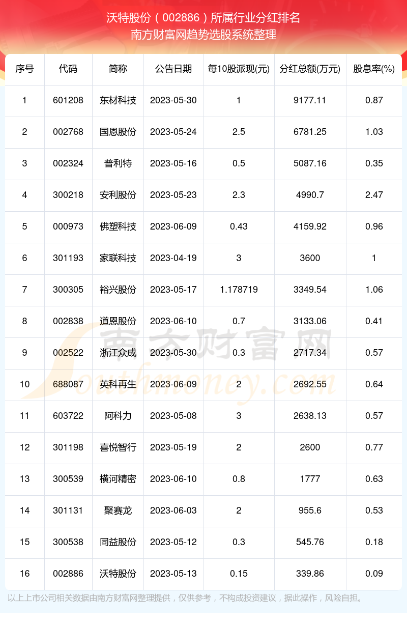按照南方财富网趋势选股系统统计,沃特股份所属行业为塑料制品行业,塑料制品行业分红排名情况如下表: