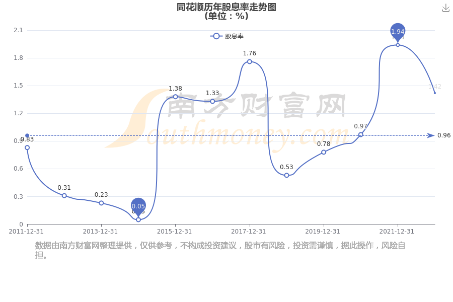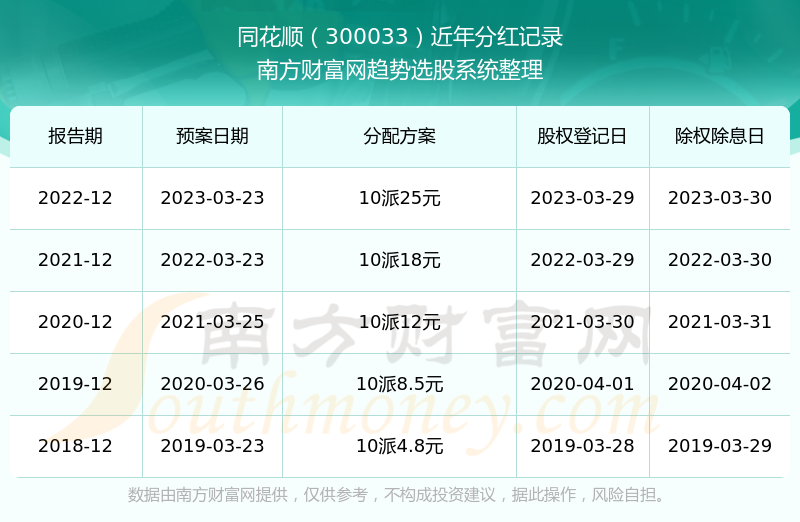 同花顺最新一次公布的分红方案为10派25元。本次权益分派股权登记日为2023年3月29日,除权除息日为2023年3月30日,派息日为2023年3月30日。