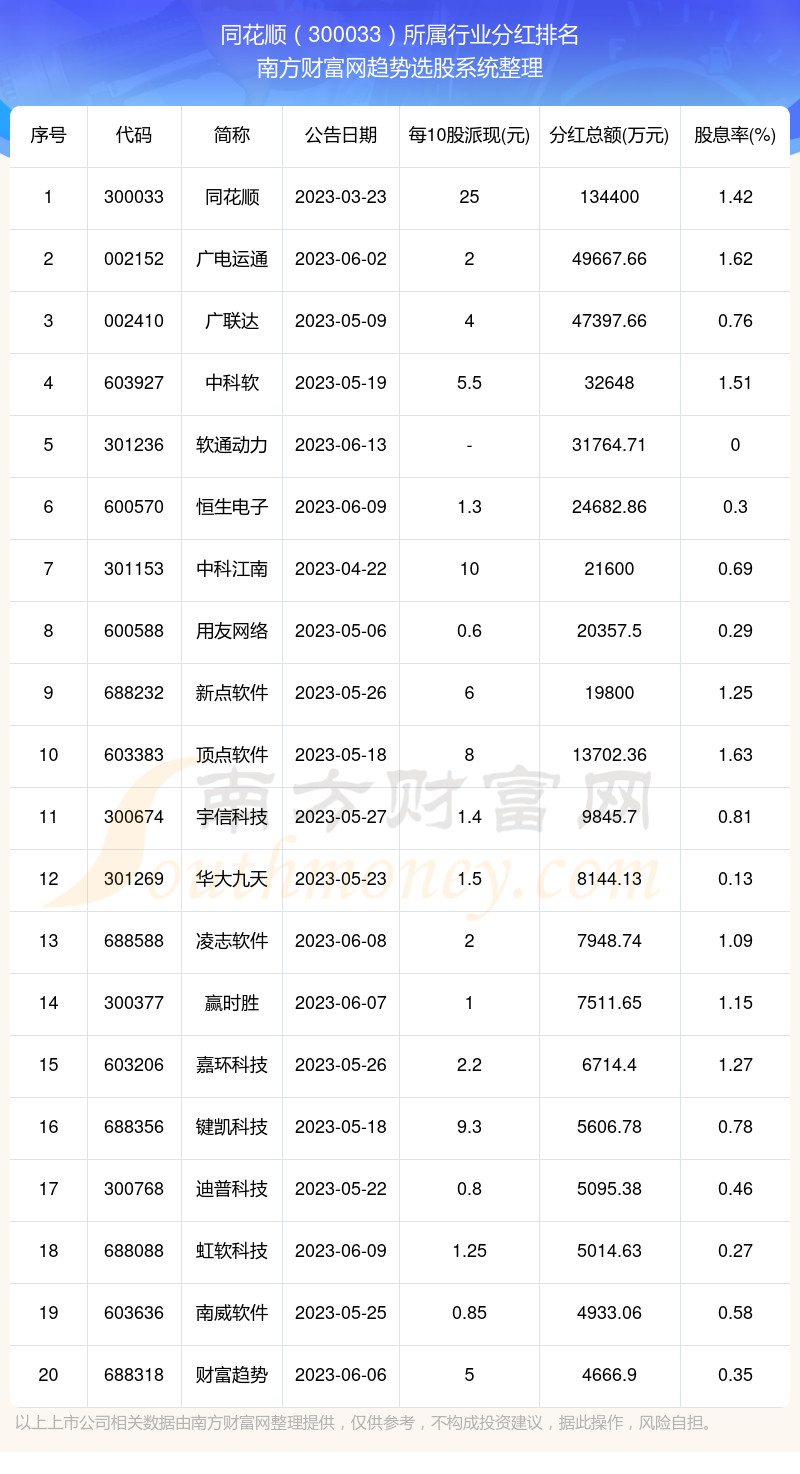 按照南方财富网趋势选股系统统计,同花顺所属行业为软件开发行业,软件开发行业分红排名情况如下表: