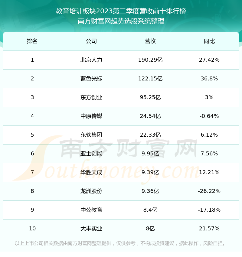 按照南方财富网趋势选股系统统计,该股所属板块为教育培训板块,该板块共有51只股票,昂立教育2023第二季度营收在该板块中排名为第24名,该板块2023第二季度营收排名前十的股票如下表: