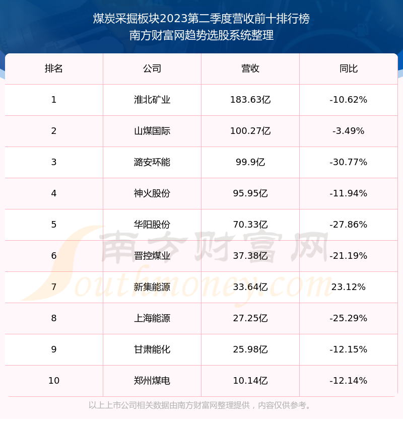 按照南方财富网趋势选股系统统计,该股所属板块为煤炭采掘板块,该板块共有11只股票,新集能源2023第二季度营收在该板块中排名为第7名,该板块2023第二季度营收排名前十的股票如下表: