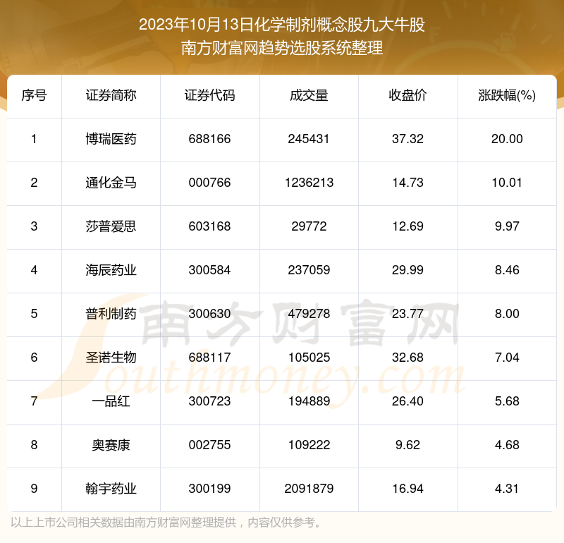 截止2023年10月13日,个股表现方面,化学制剂概念股当日领涨股为博瑞医药(688166),该股当日报收37.32,上涨20.00%,成交量24.54万。通化金马(000766)以上涨10.01%紧随其后,该股当日成交量123.62万。此外,莎普爱思(603168)、海辰药业(300584)、普利制药(300630)均进入当日化学制剂概念股牛股之列。