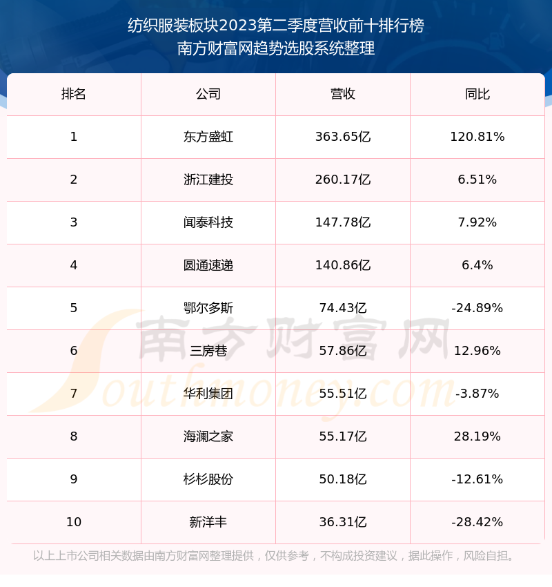 按照南方财富网趋势选股系统统计,该股所属板块为纺织服装板块,该板块共有155只股票,际华集团2023第二季度营收在该板块中排名为第17名,该板块2023第二季度营收排名前十的股票如下表: