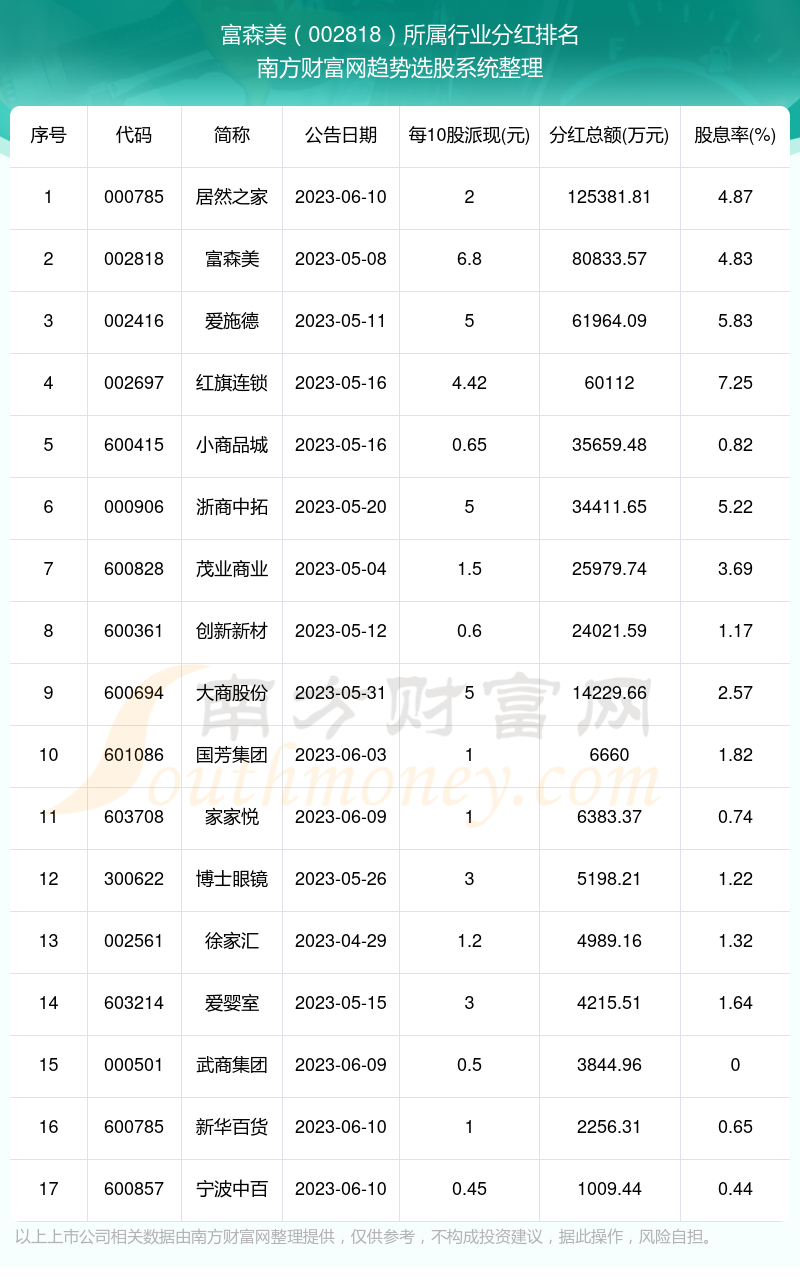 按照南方财富网趋势选股系统统计,富森美所属行业为商业百货行业,商业百货行业分红排名情况如下表: