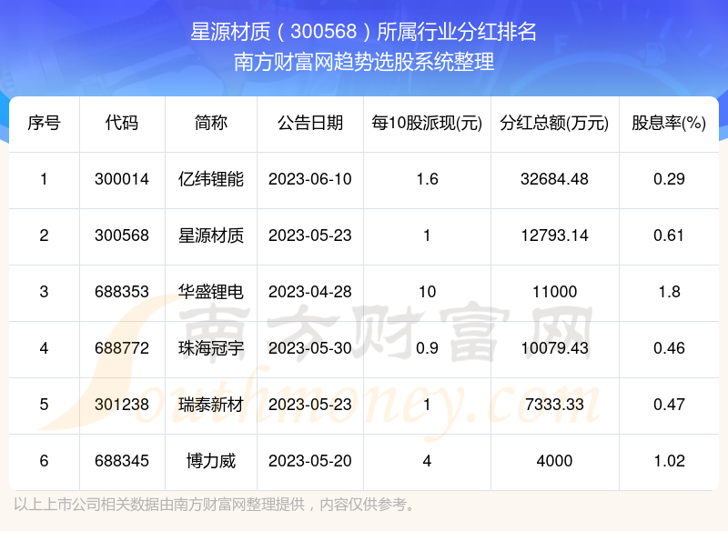按照南方财富网趋势选股系统统计,星源材质所属行业为锂离子电池行业,锂离子电池行业分红排名情况如下表: