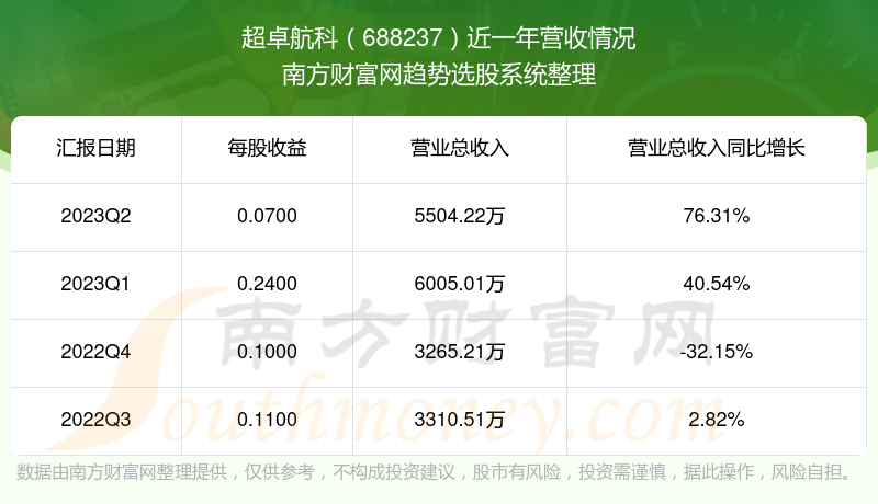 财报显示,2023年第二季度超卓航科营收5504.22万元,同比增长76.31%,净利润599.28万元,同比增长-43.54%。