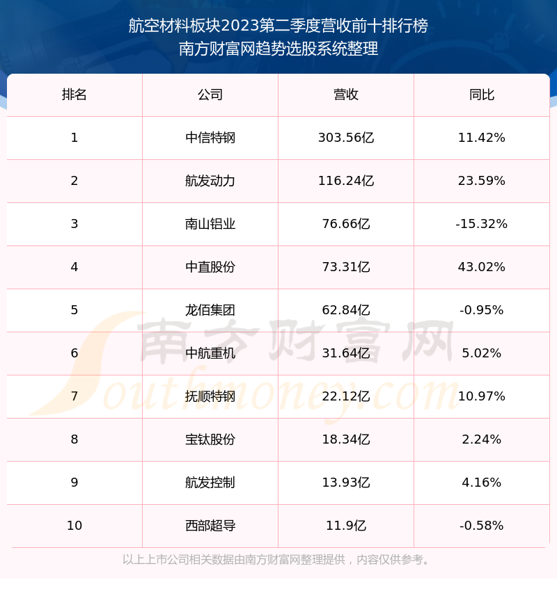 按照南方财富网趋势选股系统统计,该股所属板块为航空材料板块,该板块共有23只股票,超卓航科2023第二季度营收在该板块中排名为第23名,该板块2023第二季度营收排名前十的股票如下表: