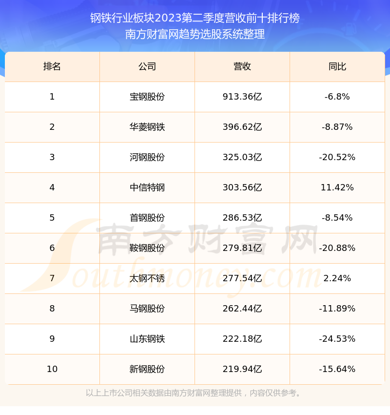 按照南方财富网趋势选股系统统计,该股所属板块为钢铁行业板块,该板块共有39只股票,山东钢铁2023第二季度营收在该板块中排名为第9名,该板块2023第二季度营收排名前十的股票如下表: