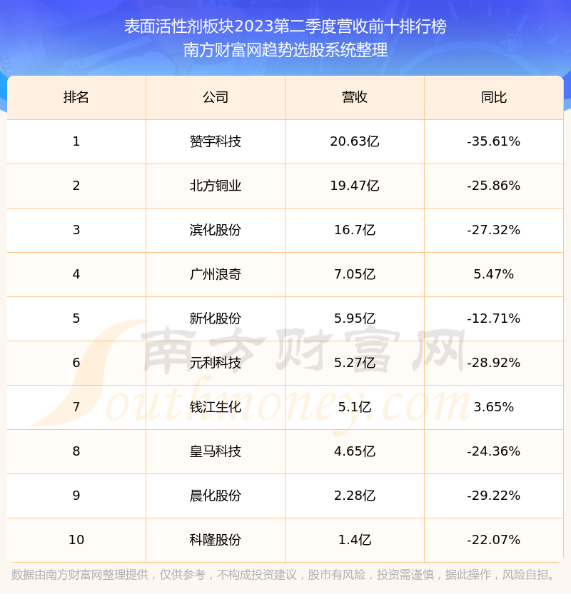 按照南方财富网趋势选股系统统计,该股所属板块为表面活性剂板块,该板块共有12只股票,皇马科技2023第二季度营收在该板块中排名为第8名,该板块2023第二季度营收排名前十的股票如下表: