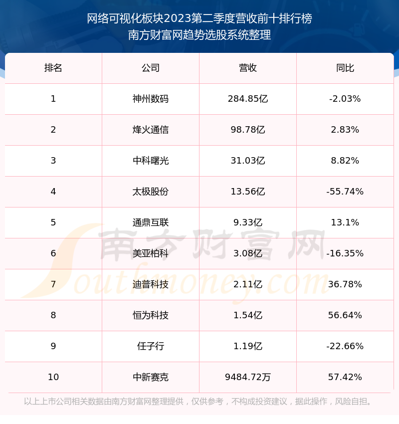 按照南方财富网趋势选股系统统计,该股所属板块为网络可视化板块,该板块共有11只股票,恒为科技2023第二季度营收在该板块中排名为第8名,该板块2023第二季度营收排名前十的股票如下表: