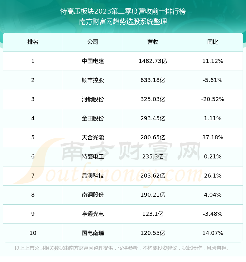 按照南方财富网趋势选股系统统计,该股所属板块为特高压板块,该板块共有145只股票,亿嘉和2023第二季度营收在该板块中排名为第129名,该板块2023第二季度营收排名前十的股票如下表: