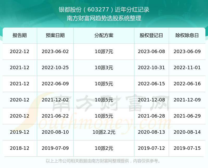 银都股份最新一次公布的分红方案为10派7元。本次权益分派股权登记日为2023年6月8日,除权除息日为2023年6月9日,派息日为2023年6月9日。