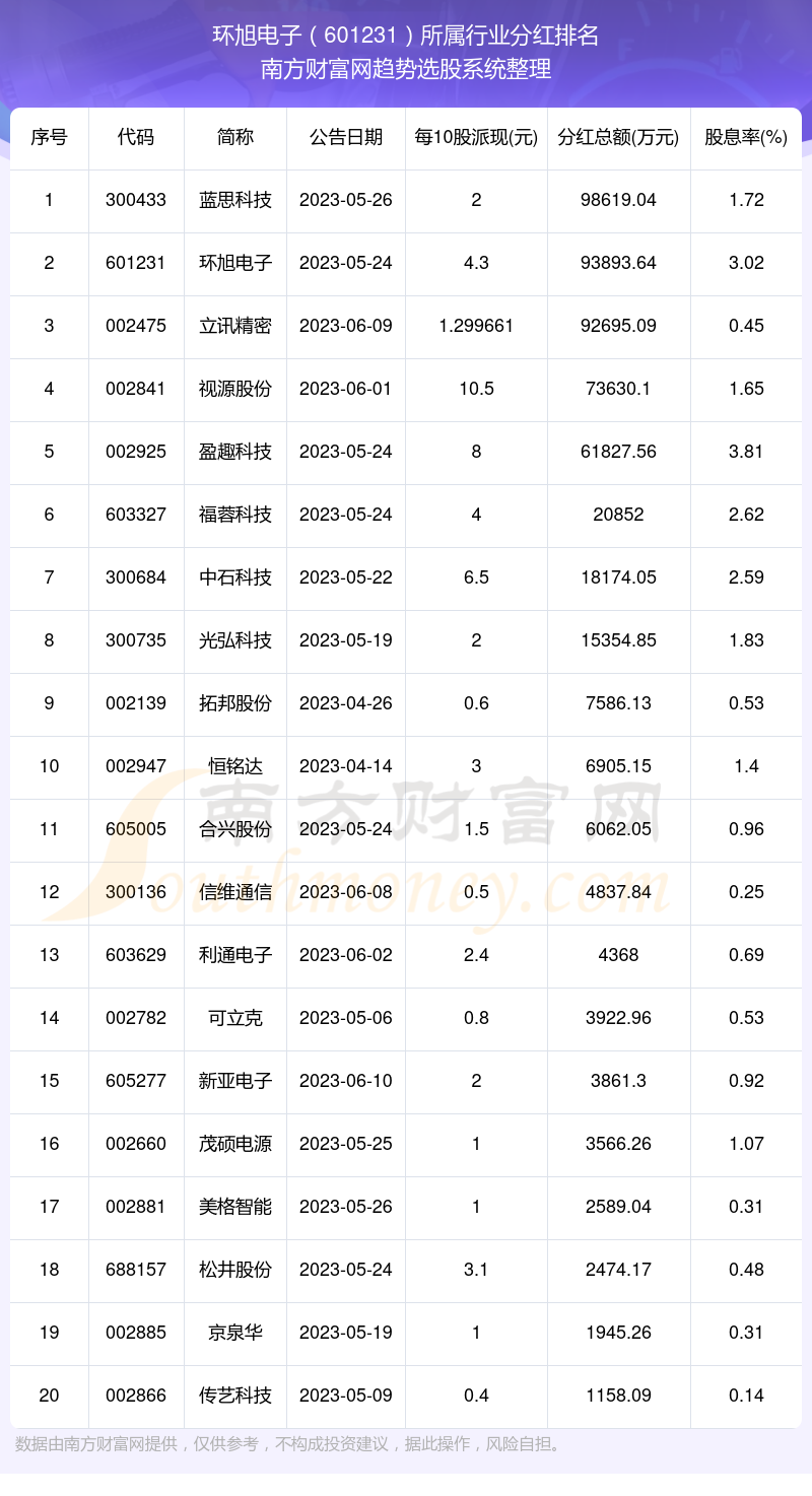 按照南方财富网趋势选股系统统计,环旭电子所属行业为通讯产品行业,通讯产品行业分红排名情况如下表: