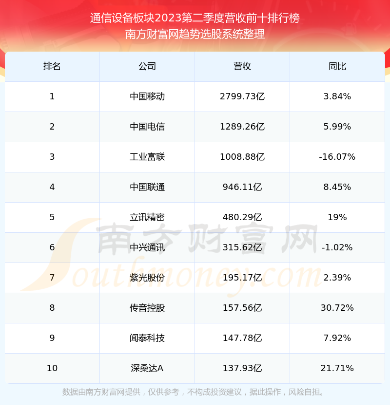 按照南方财富网趋势选股系统统计,该股所属板块为通信设备板块,该板块共有128只股票,长江通信2023第二季度营收在该板块中排名为第125名,该板块2023第二季度营收排名前十的股票如下表: