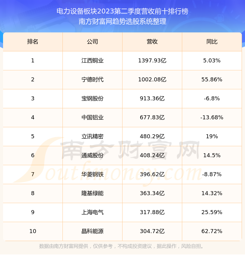 按照南方财富网趋势选股系统统计,该股所属板块为电力设备板块,该板块共有102只股票,煜邦电力2023第二季度营收在该板块中排名为第102名,该板块2023第二季度营收排名前十的股票如下表: