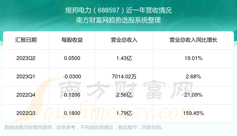 财报显示,2023年第二季度煜邦电力营收1.43亿元,同比增长19.01%,净利润952.83万元,同比增长-52.34%。