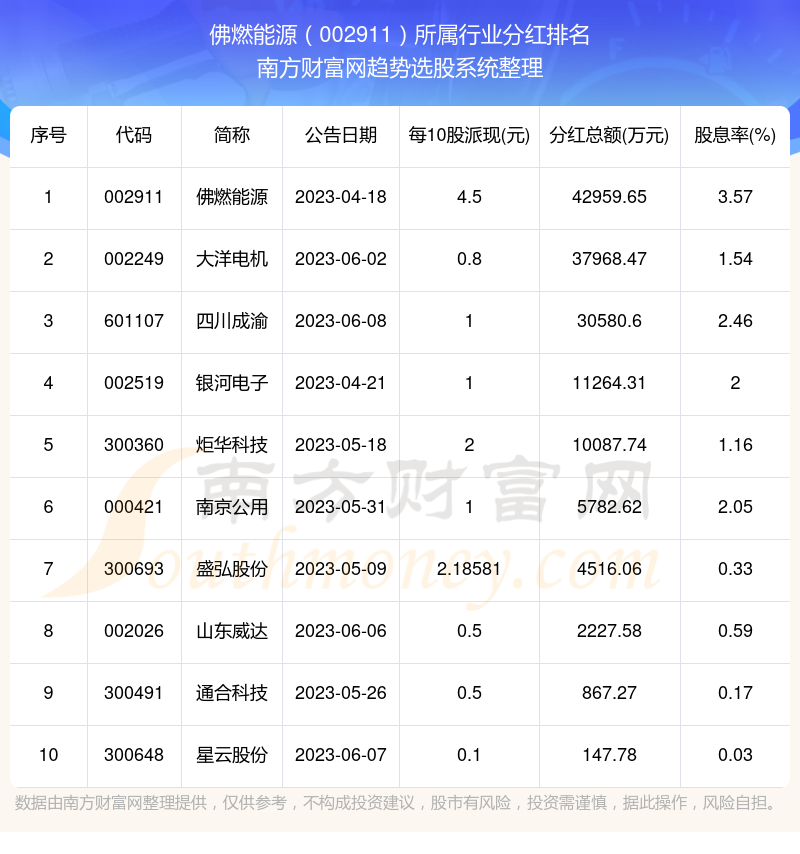 按照南方财富网趋势选股系统统计,佛燃能源所属行业为天然气行业,天然气行业分红排名情况如下表: