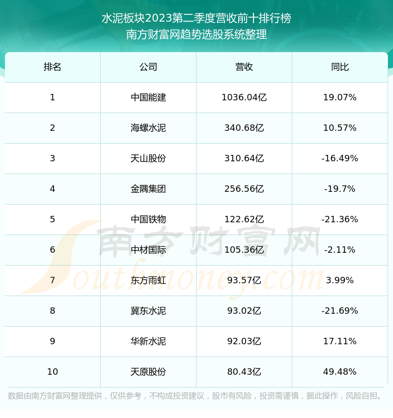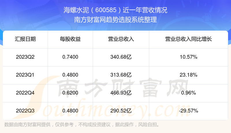 按照南方财富网趋势选股系统统计,该股所属板块为水泥板块,该板块共有48只股票,海螺水泥2023第二季度营收在该板块中排名为第2名,该板块2023第二季度营收排名前十的股票如下表: