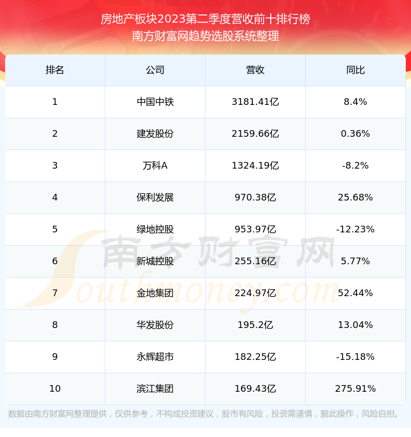 按照南方财富网趋势选股系统统计,该股所属板块为房地产板块,该板块共有176只股票,春兰股份2023第二季度营收在该板块中排名为第165名,该板块2023第二季度营收排名前十的股票如下表: