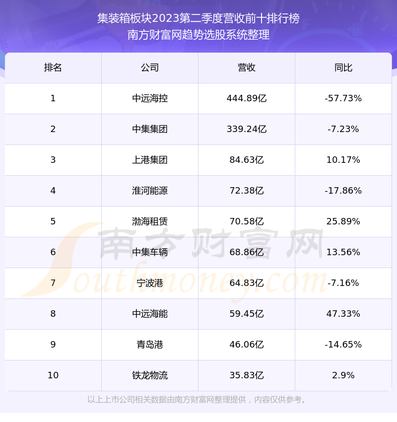 按照南方财富网趋势选股系统统计,该股所属板块为集装箱板块,该板块共有25只股票,上港集团2023第二季度营收在该板块中排名为第3名,该板块2023第二季度营收排名前十的股票如下表: