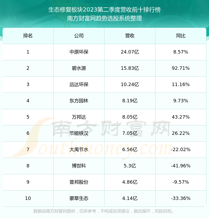 按照南方财富网趋势选股系统统计,该股所属板块为生态修复板块,该板块共有23只股票,正和生态2023第二季度营收在该板块中排名为第22名,该板块2023第二季度营收排名前十的股票如下表: