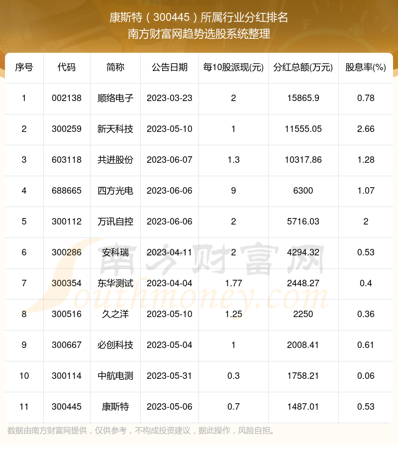 按照南方财富网趋势选股系统统计,康斯特所属行业为仪器仪表行业,仪器仪表行业分红排名情况如下表: