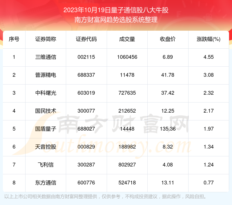 截止2023年10月19日,个股表现方面,量子通信股当日领涨股为三维通信(002115),该股当日报收6.89,上涨4.55%,成交量106.05万。普源精电(688337)以上涨3.08%紧随其后,该股当日成交量1.15万。此外,中科曙光(603019)、国民技术(300077)、国盾量子(688027)均进入当日量子通信股牛股之列。