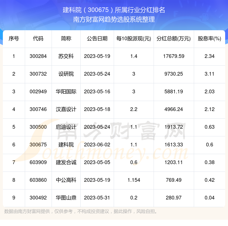 按照南方财富网趋势选股系统统计,建科院所属行业为工程咨询服务行业,工程咨询服务行业分红排名情况如下表: