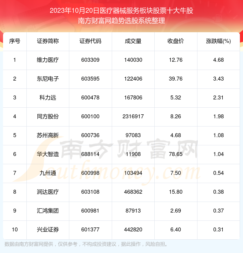截止2023年10月20日,个股表现方面,医疗器械服务板块股票当日领涨股为维力医疗(603309),该股当日报收12.76,上涨4.68%,成交量14万。东尼电子(603595)以上涨3.43%紧随其后,该股当日成交量12.24万。此外,科力远(600478)、同方股份(600100)、苏州高新(600736)均进入当日医疗器械服务板块股票牛股之列。