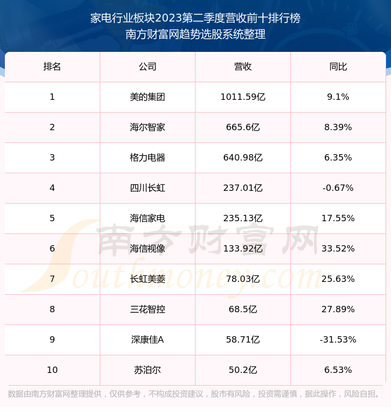 按照南方财富网趋势选股系统统计,该股所属板块为家电行业板块,该板块共有63只股票,惠而浦2023第二季度营收在该板块中排名为第31名,该板块2023第二季度营收排名前十的股票如下表: