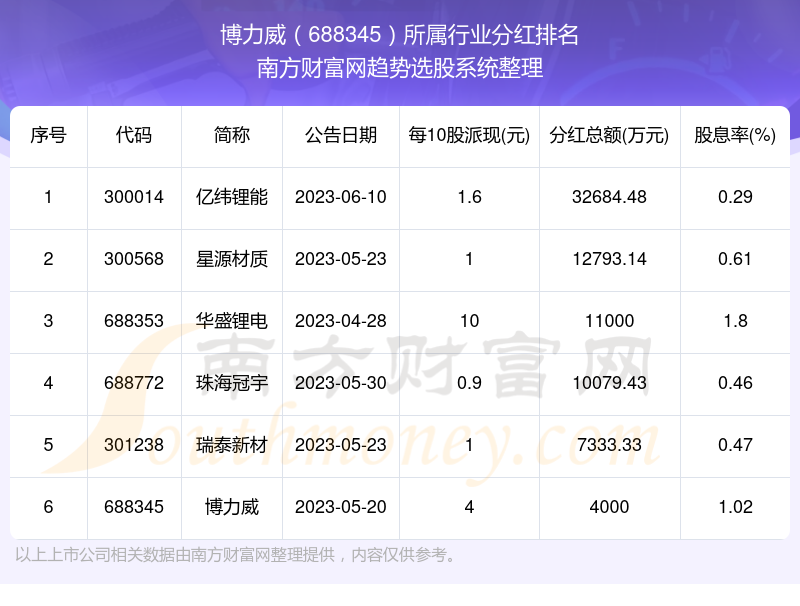 按照南方财富网趋势选股系统统计,博力威所属行业为锂离子电池行业,锂离子电池行业分红排名情况如下表: