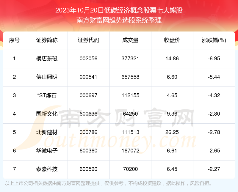 截止2023年10月20日,个股表现方面,低碳经济概念股票当日领跌股为横店东磁(002056),该股当日报收14.86,上涨-6.95%,成交量37.73万。佛山照明(000541)以下跌-5.44%紧随其后,该股当日成交量65.76万。此外,*ST炼石(000697)、国新文化(600636)、北新建材(000786)均进入当日低碳经济概念股票熊股之列。