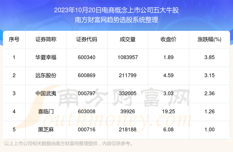 截止2023年10月20日,个股表现方面,电商概念上市公司当日领涨股为华夏幸福(600340),该股当日报收1.89,上涨3.85%,成交量108.4万。远东股份(600869)以上涨3.15%紧随其后,该股当日成交量21.18万。此外,中国武夷(000797)、喜临门(603008)、黑芝麻(000716)均进入当日电商概念上市公司牛股之列。