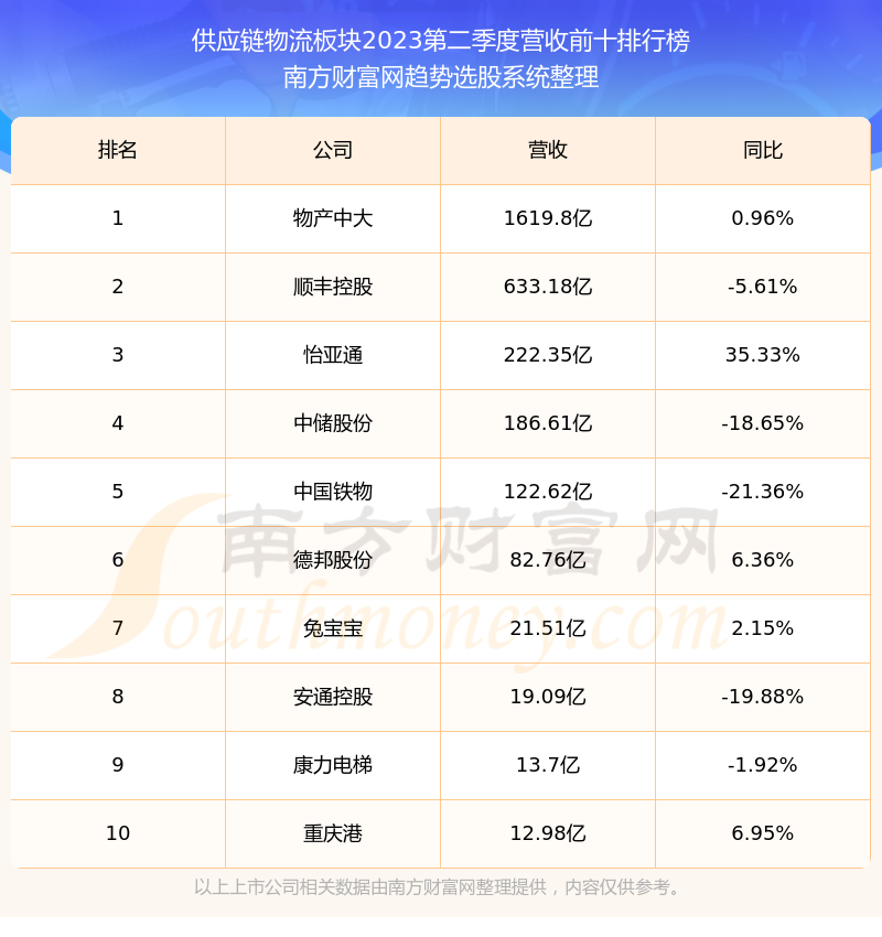 按照南方财富网趋势选股系统统计,该股所属板块为供应链物流板块,该板块共有24只股票,亿利洁能2023第二季度营收在该板块中排名为第24名,该板块2023第二季度营收排名前十的股票如下表: