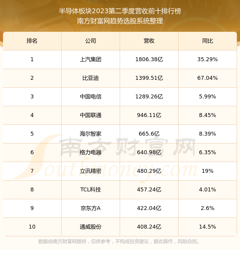 按照南方财富网趋势选股系统统计,该股所属板块为半导体板块,该板块共有463只股票,海光信息2023第二季度营收在该板块中排名为第101名,该板块2023第二季度营收排名前十的股票如下表: