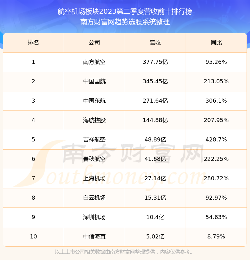 按照南方财富网趋势选股系统统计,该股所属板块为航空机场板块,该板块共有11只股票,南方航空2023第二季度营收在该板块中排名为第1名,该板块2023第二季度营收排名前十的股票如下表: