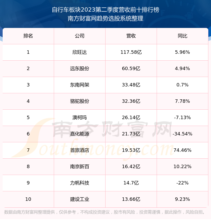 按照南方财富网趋势选股系统统计,该股所属板块为自行车板块,该板块共有35只股票,中路股份2023第二季度营收在该板块中排名为第28名,该板块2023第二季度营收排名前十的股票如下表: