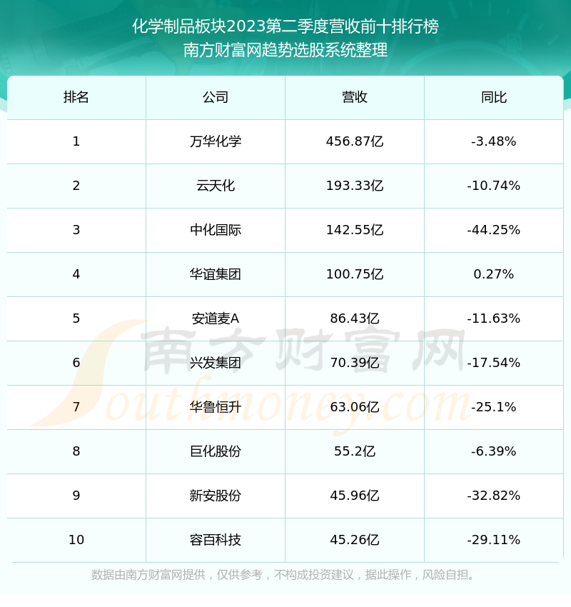 按照南方财富网趋势选股系统统计,该股所属板块为化学制品板块,该板块共有133只股票,雪峰科技2023第二季度营收在该板块中排名为第24名,该板块2023第二季度营收排名前十的股票如下表: