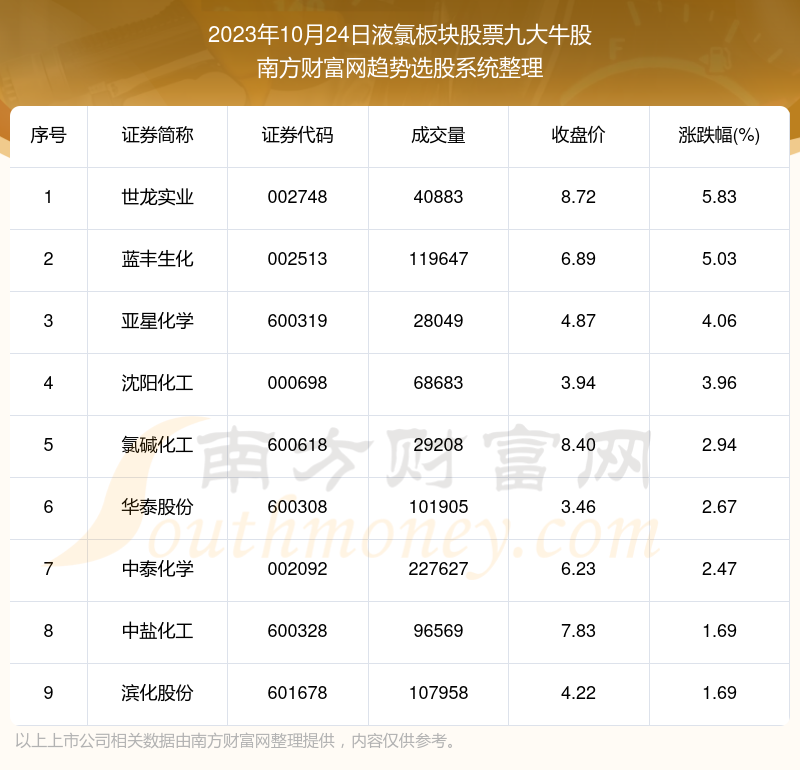 截止2023年10月24日,个股表现方面,液氯板块股票当日领涨股为世龙实业(002748),该股当日报收8.72,上涨5.83%,成交量4.09万。蓝丰生化(002513)以上涨5.03%紧随其后,该股当日成交量11.96万。此外,亚星化学(600319)、沈阳化工(000698)、氯碱化工(600618)均进入当日液氯板块股票牛股之列。