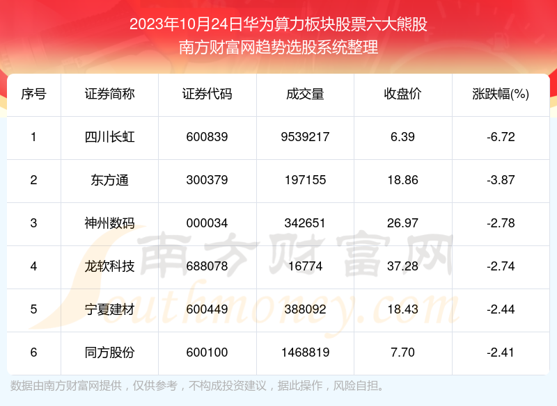 截止2023年10月24日,个股表现方面,华为算力板块股票当日领跌股为四川长虹(600839),该股当日报收6.39,上涨-6.72%,成交量953.92万。东方通(300379)以下跌-3.87%紧随其后,该股当日成交量19.72万。此外,神州数码(000034)、龙软科技(688078)、宁夏建材(600449)均进入当日华为算力板块股票熊股之列。