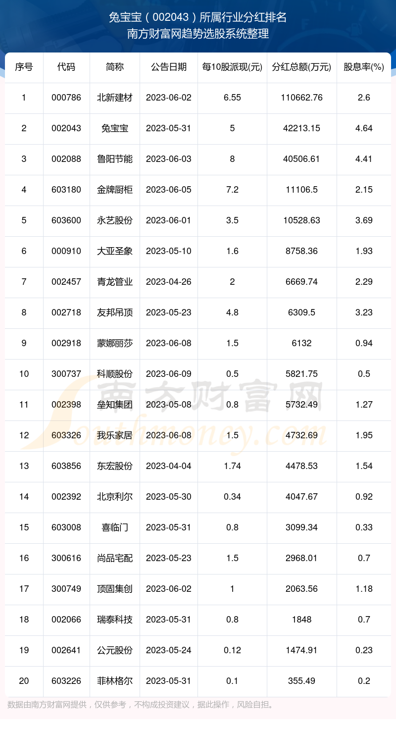 以上就是网络对免息配资平台 兔宝宝每年分红多少_002043所属行业股票分红排名情况的解读(https://www.youge168.com/news-pzhq/49193.html)希望可以帮助您。