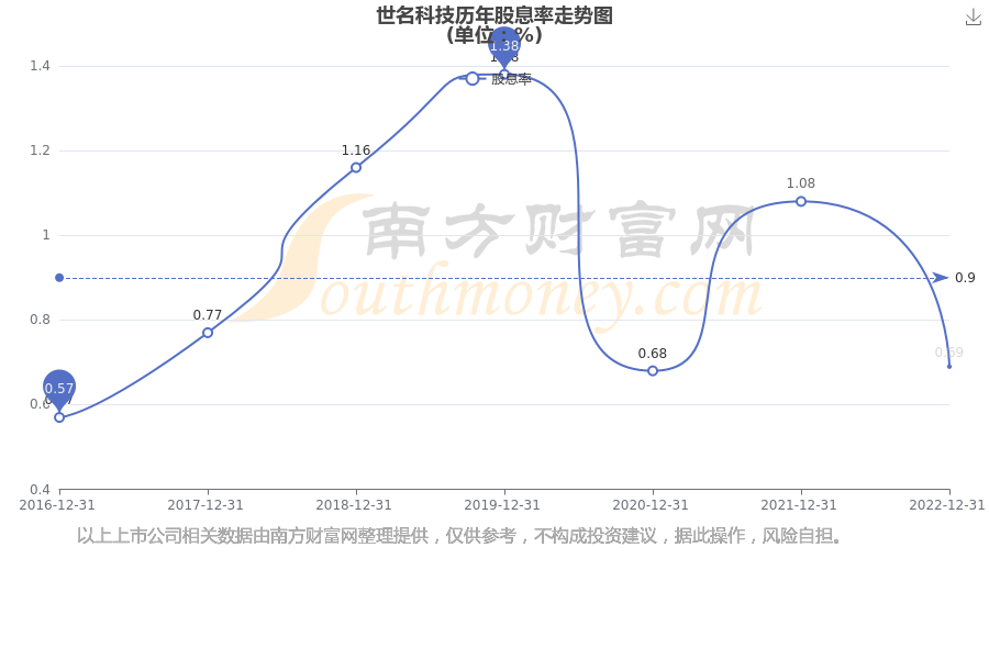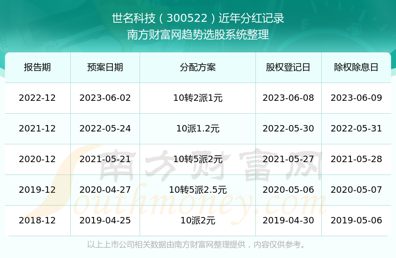 世名科技最新一次公布的分红方案为10转2派1元。本次权益分派股权登记日为2023年6月8日,除权除息日为2023年6月9日,派息日为2023年6月9日。