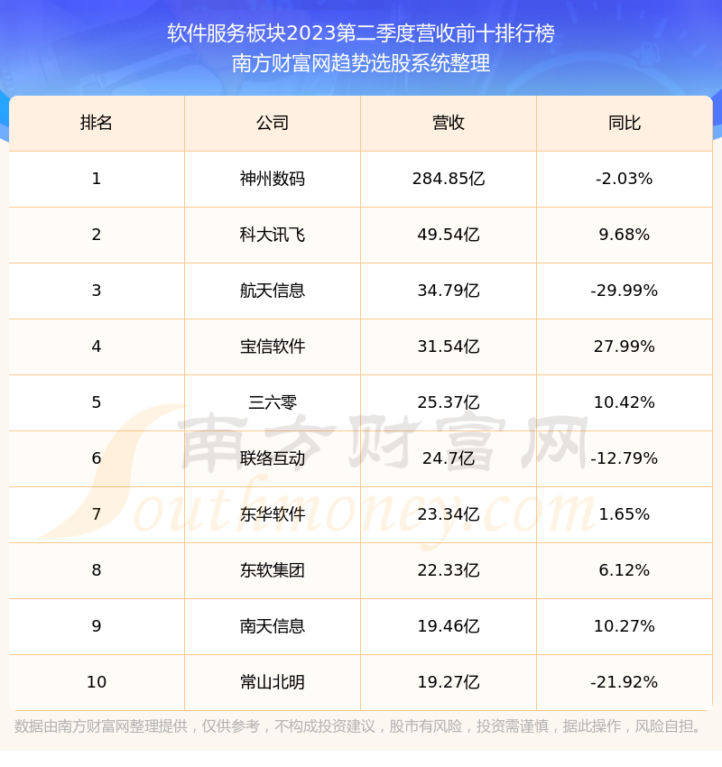按照南方财富网趋势选股系统统计,该股所属板块为软件服务板块,该板块共有215只股票,宝兰德2023第二季度营收在该板块中排名为第182名,该板块2023第二季度营收排名前十的股票如下表: